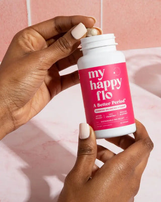 My Happy Flo is *not* just another painkiller to pop when your period cramps your style, Queen! With a blend of seven vitamins and three plant nutrients, our all-natural supplement tackles the root cause of painful periods: Hormonal imbalances. Free from sugars, fillers, preservatives and hormone disruptors, it’s self-care in a bottle.